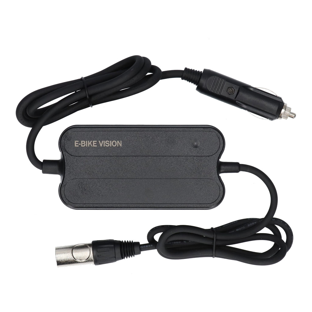 Voor alle E-Bike Vision batterijen met 36 V nominale spanning bieden wij een compacte 2 A autolader (36 V) met een gewicht van slechts ca. 375 gram aan. Met deze lader kun je de accu's opladen op 12V, bijv. in de auto of camper! Dankzij het geringe gewicht, de geringe afmetingen en de fluisterstille ventilator is deze snellader ook een ideale vakantie- en reislader.