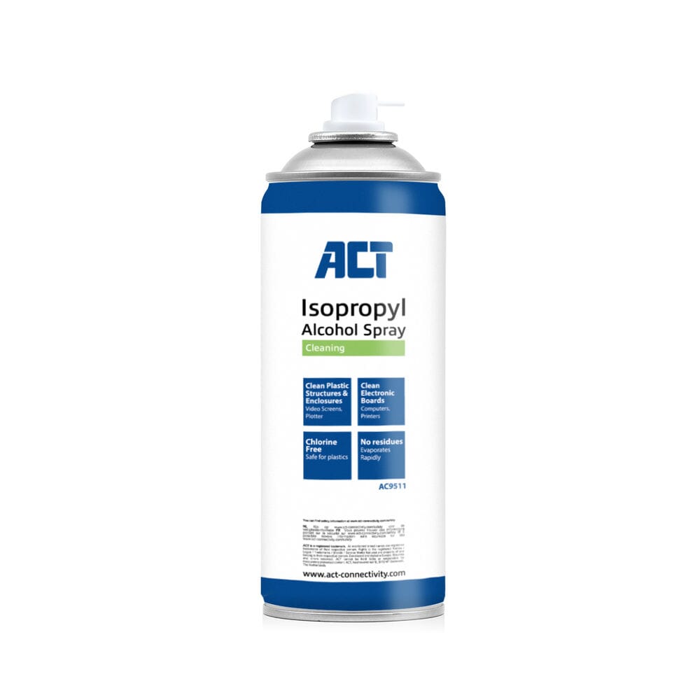 ACT AC9511 Isopropyl Alcohol spray is ideaal voor het schoonmaken van printplaten en plastic onderdelen van computers en printers. De spray is chloorvrij, laat geen resten achter en verdampt snel. Daarnaast is de Isopropyl Alcohol spray 100% ozonvriendelijk.