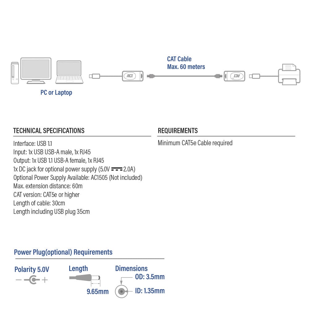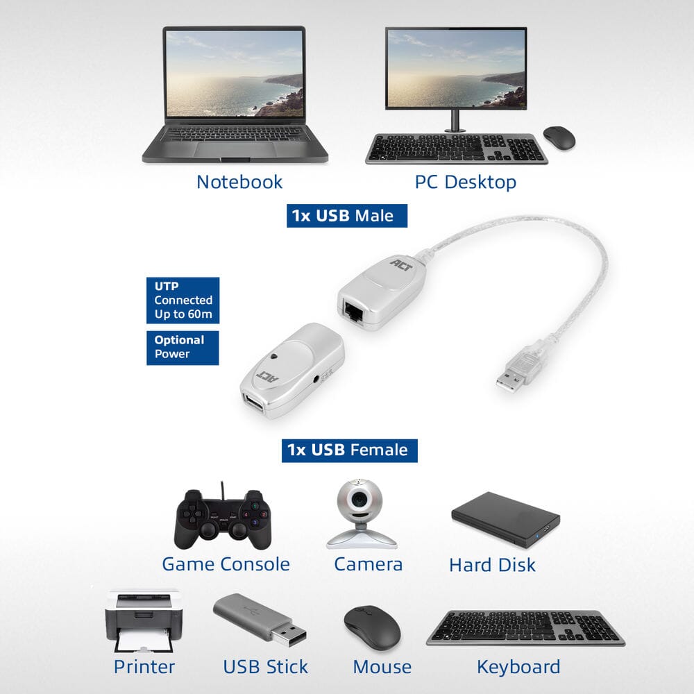 ACT USB Extender set over UTP, extender tot 60 meter